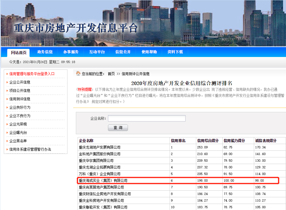 近日,重慶市房地產(chǎn)開發(fā)信息平臺,基于《重慶市房地產(chǎn)開發(fā)行業(yè)信用體系建設(shè)與管理暫行辦法》規(guī)定,對外發(fā)布《2020年度房地產(chǎn)信用綜合測評排名》,海成集團(tuán)榮膺第6名。