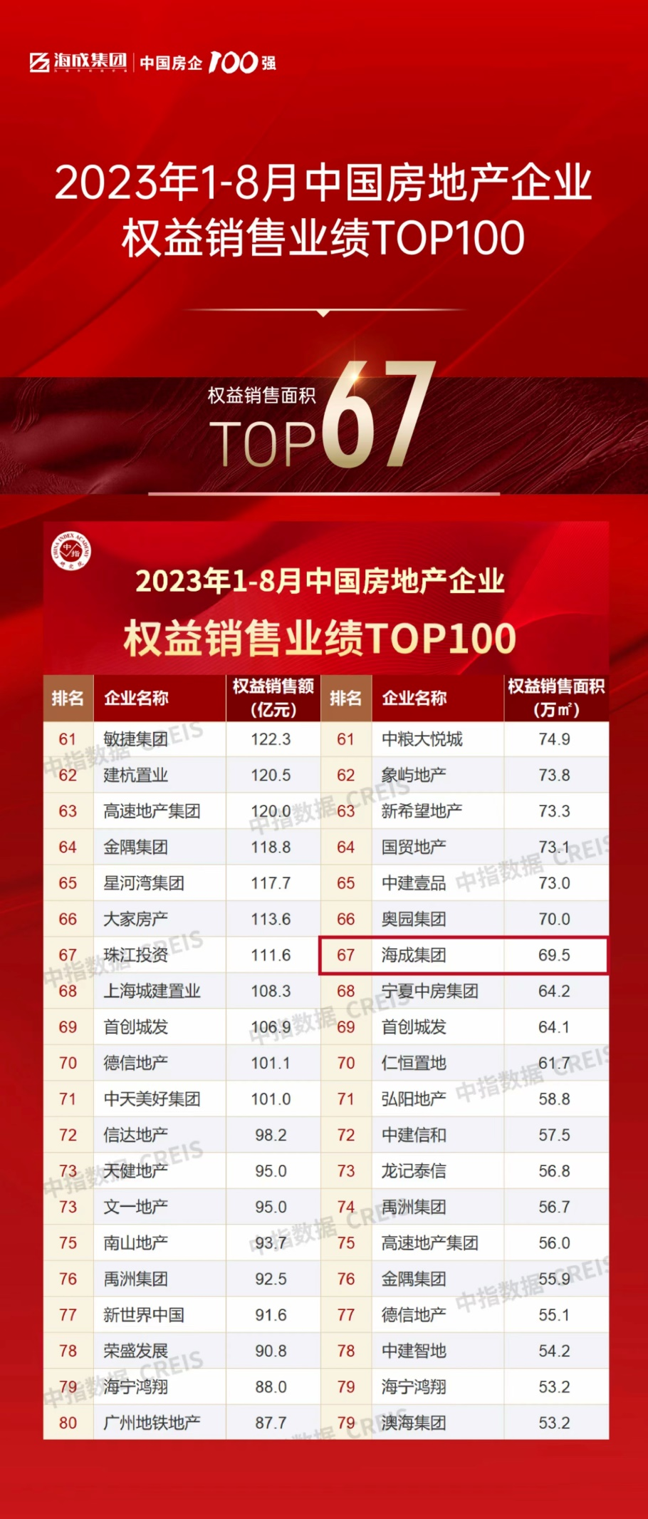 在穩(wěn)健發(fā)展的戰(zhàn)略框架下,海成堅(jiān)持長(zhǎng)期主義,不盲目擴(kuò)張,專注提升產(chǎn)品力、服務(wù)力。以69.5萬(wàn)㎡的銷售面積,位列1-8月全國(guó)房企權(quán)益銷售面積TOP67。