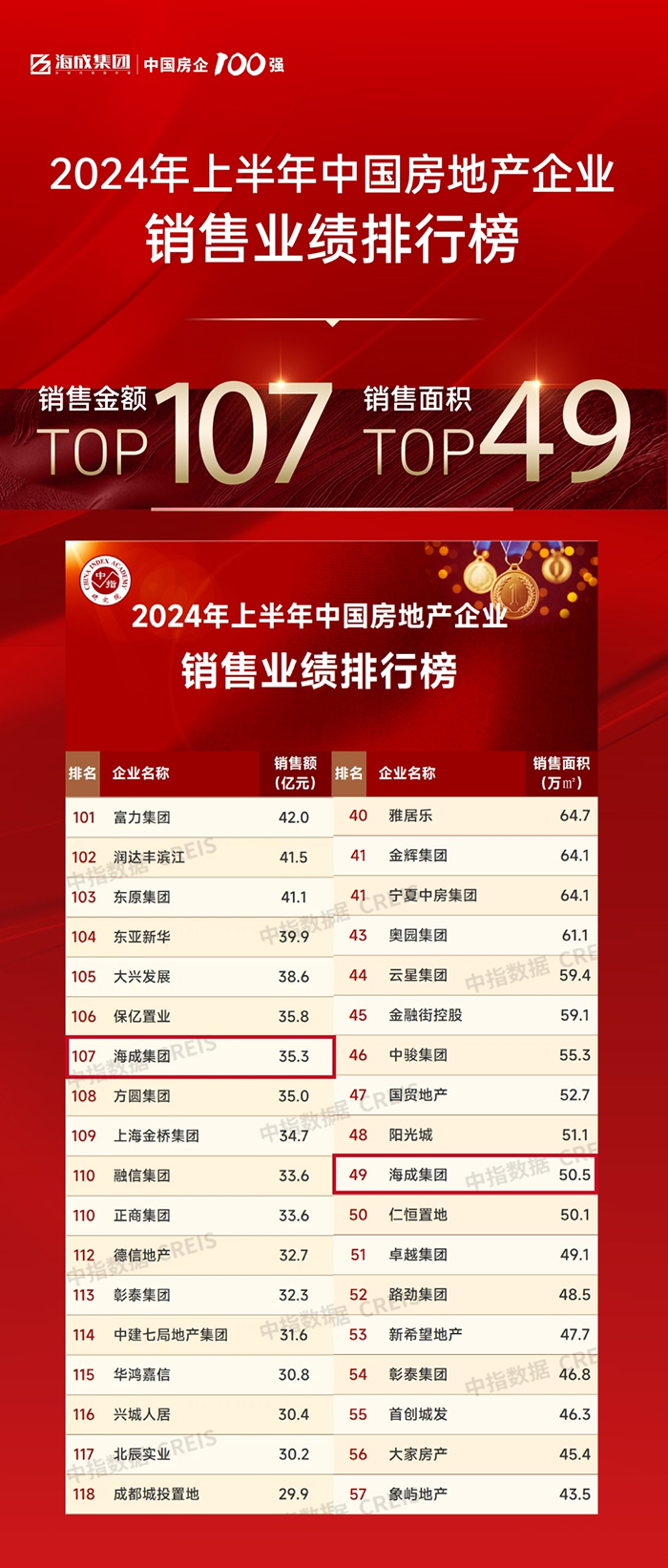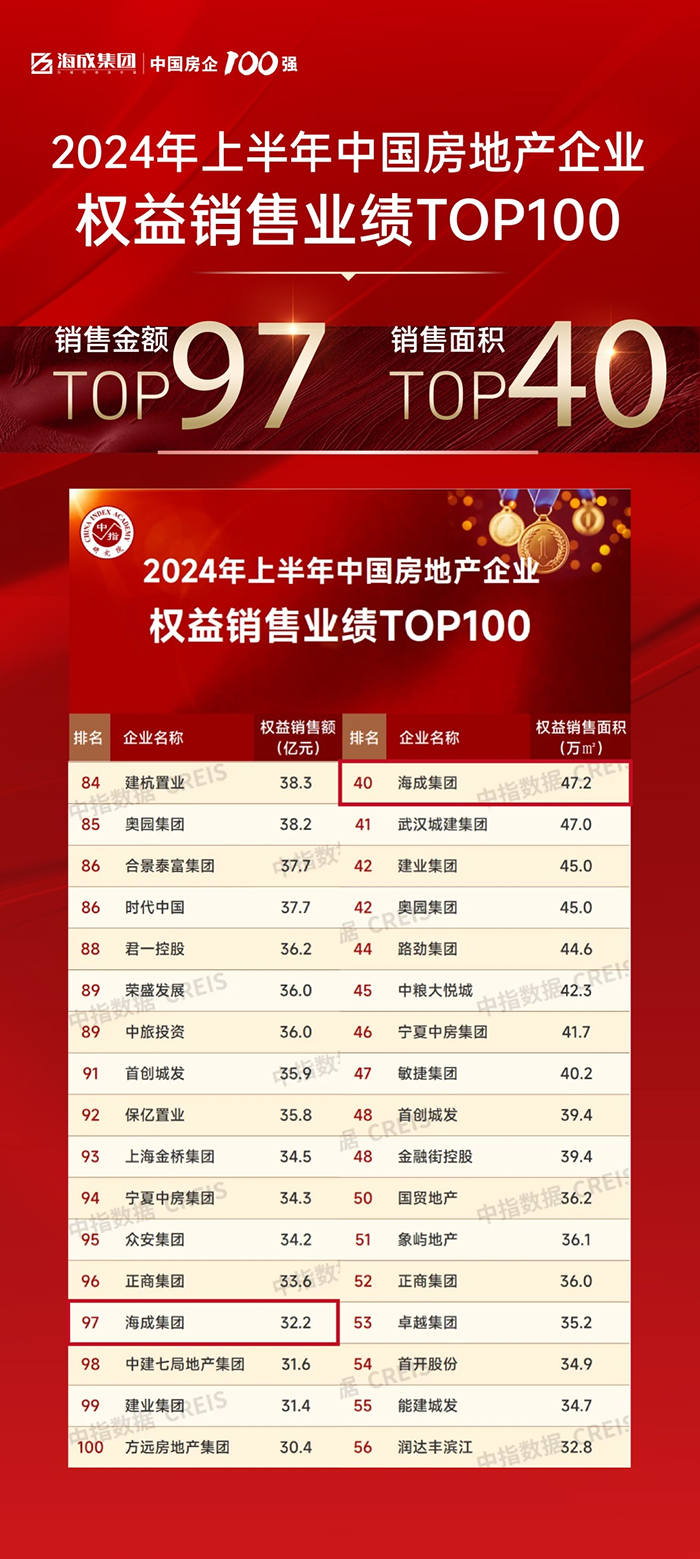 在中指研究院發(fā)布的全國房地產企業(yè)2024年上半年銷售業(yè)績排行榜中,海成集團以35.3億元的銷售額,位列上半年全國房地產企業(yè)銷售業(yè)績榜第107名;以50.5萬㎡的銷售面積,位列上半年全國房地產企業(yè)銷售業(yè)績榜第49名。以47.2萬㎡的銷售面積,位列上半年全國房企權益銷售面積TOP40;以32.2億元的銷售金額,位列上半年全國房企權益銷售金額TOP97。