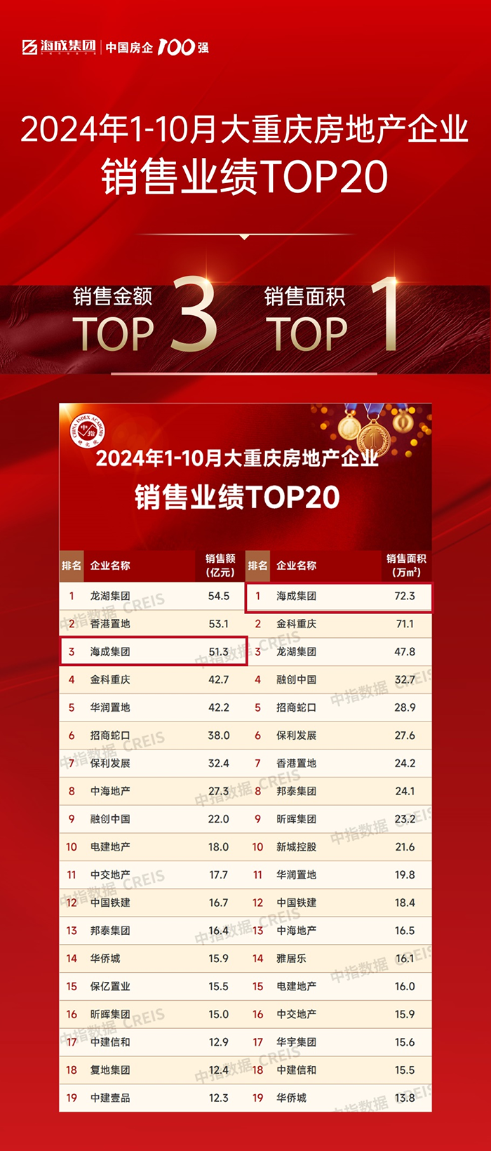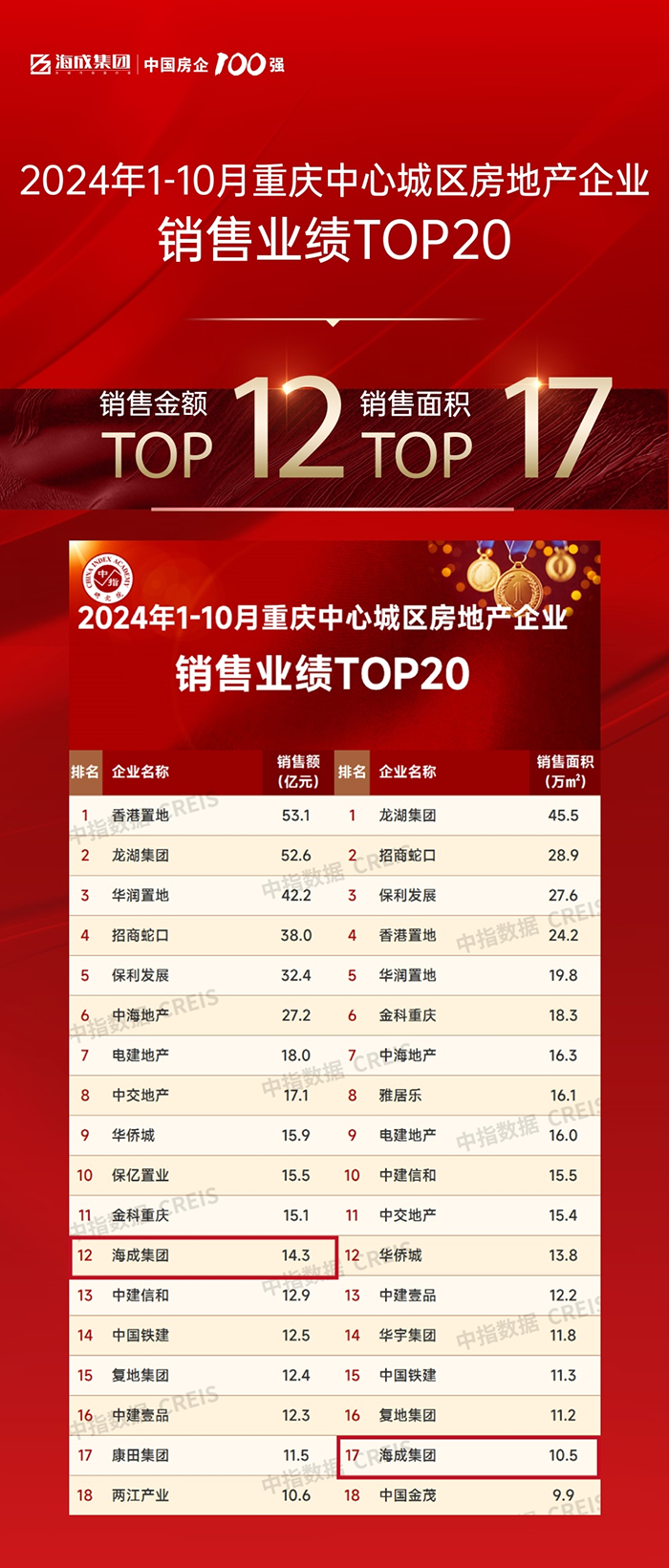 海成集團(tuán)位居1-10月大重慶房企銷(xiāo)售金額TOP3、銷(xiāo)售面積TOP1;中心城區(qū)銷(xiāo)售金額TOP12、銷(xiāo)售面積TOP17