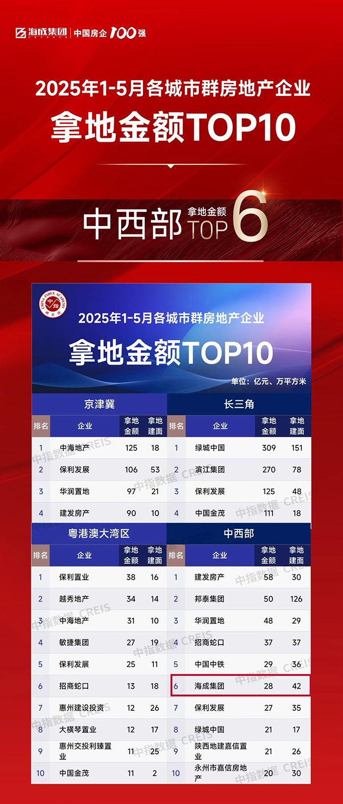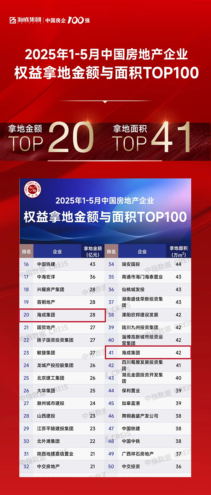 穩(wěn)步前行 | 海成集團(tuán)位居全國1-5月房企拿地金額TOP20 & 拿地面積TOP41
