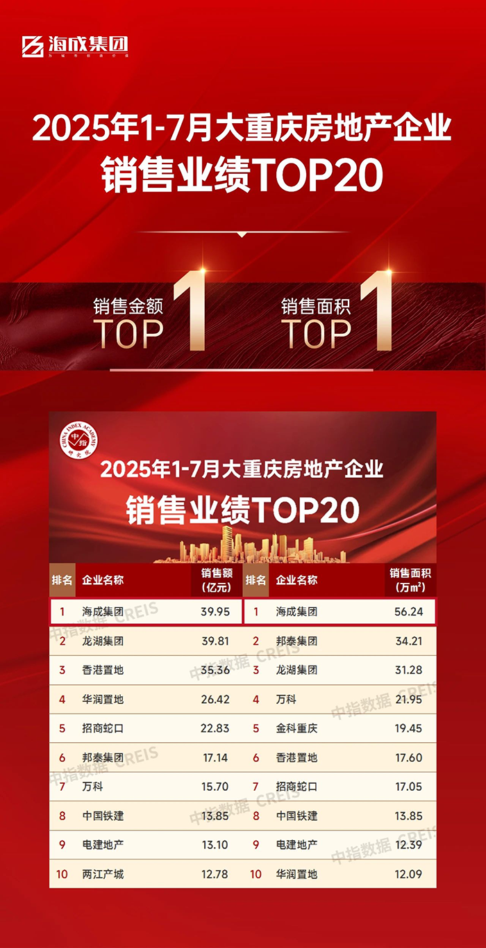 穩(wěn)步新程 | 海成集團(tuán)位居1-7月大重慶房企銷售金額TOP1 & 銷售面積TOP1