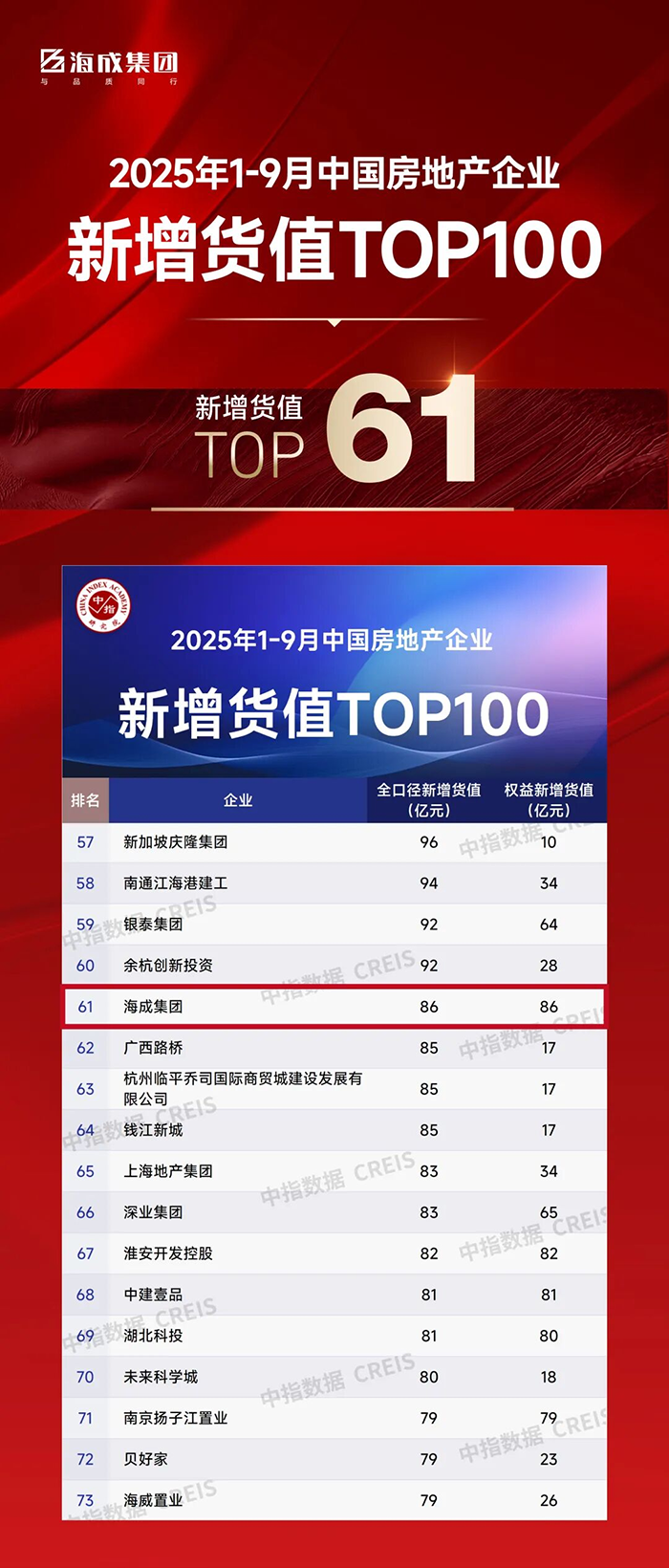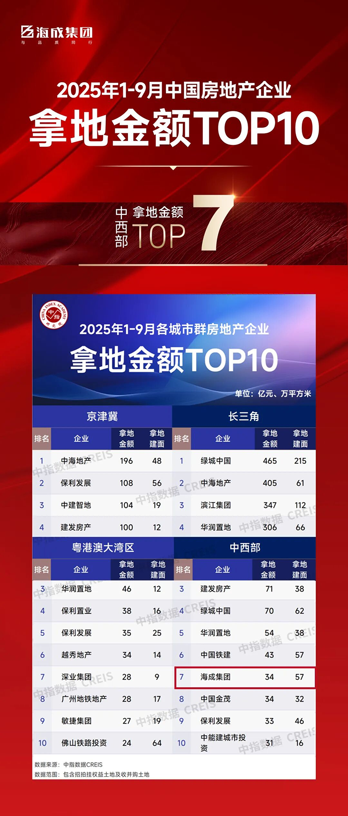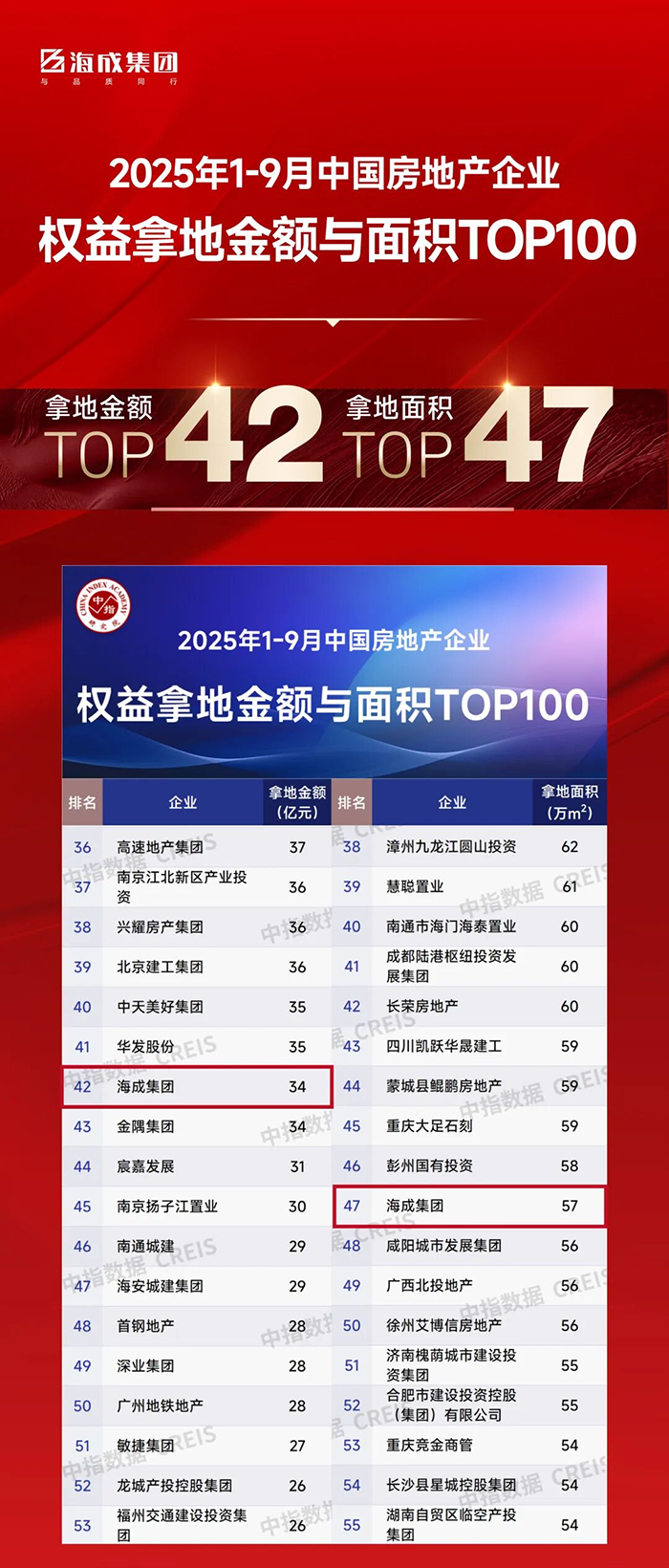 篤行致遠 | 海成集團位居全國 1-9 月 房企拿地金額TOP42 & 拿地面積TOP47