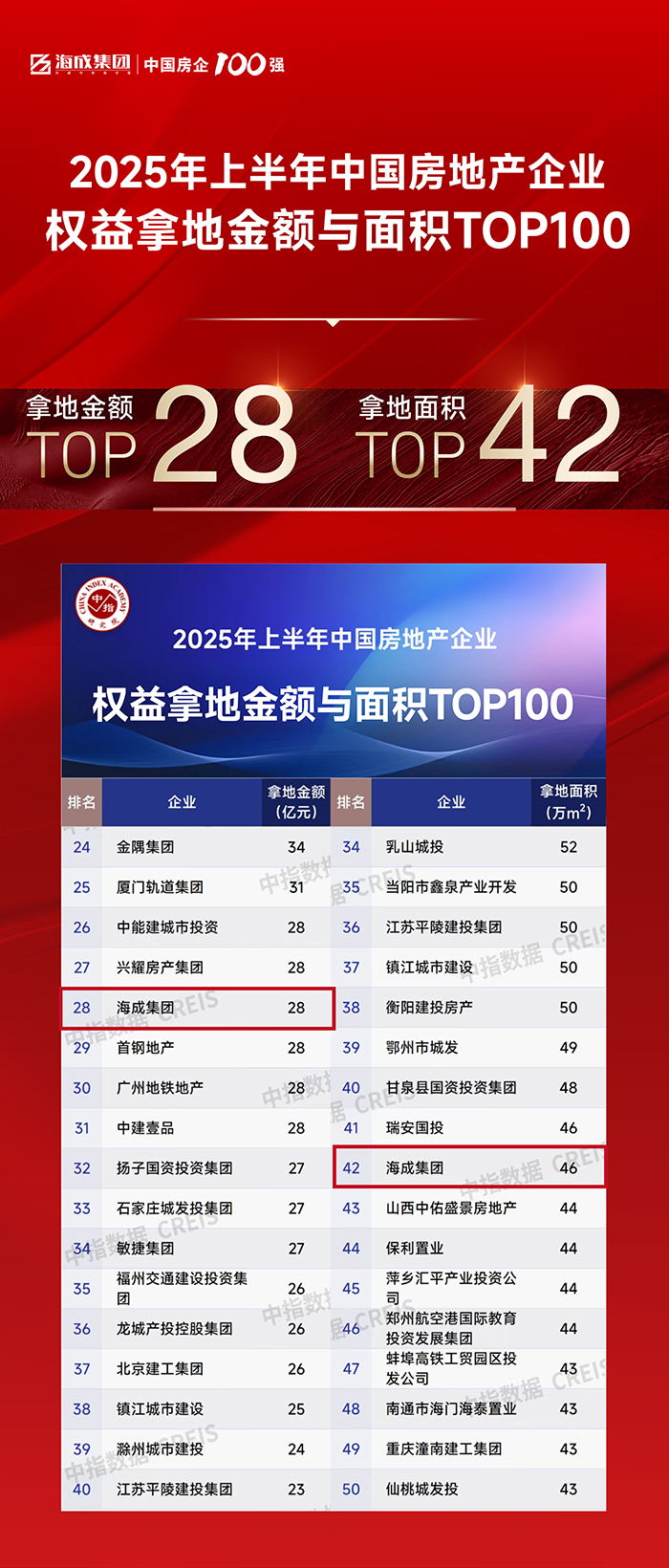 致遠篤行 | 海成集團位居全國上半年房企拿地金額TOP28 & 拿地面積TOP42